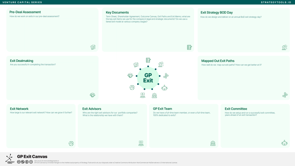 About the GP Exit Canvas: The GP Exit Canvas is part of the Venture Capital Series developed by Strategy Tools. Download the canvas and explore additional resources at www.strategytools.io.