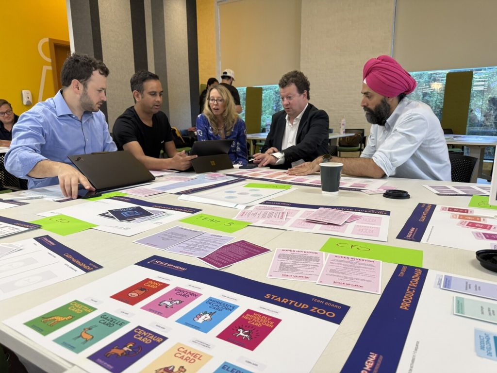 Fifteen founders experienced the full founder journey—from idea through multiple funding rounds to exit—inside the Scale Up! simulation. Working in teams as CEO, CFO, and CRO, participants structured and closed funding rounds, selected and traded investors, responded to board demands, explored acquisitions, and executed high-stakes exits—learning firsthand how early decisions compound over time.