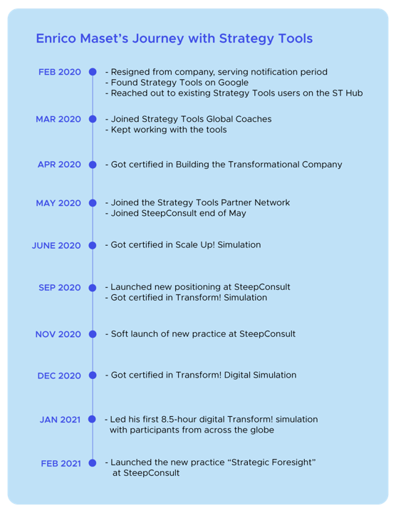 After interviewing people on the Strategy Tools Hub about their experience with Strategy Tools, Enrico decided to take the leap and joined the Strategy Tools Global Coaches program in March 2020. He also took on the Building the Transformational Company program in April 2020.