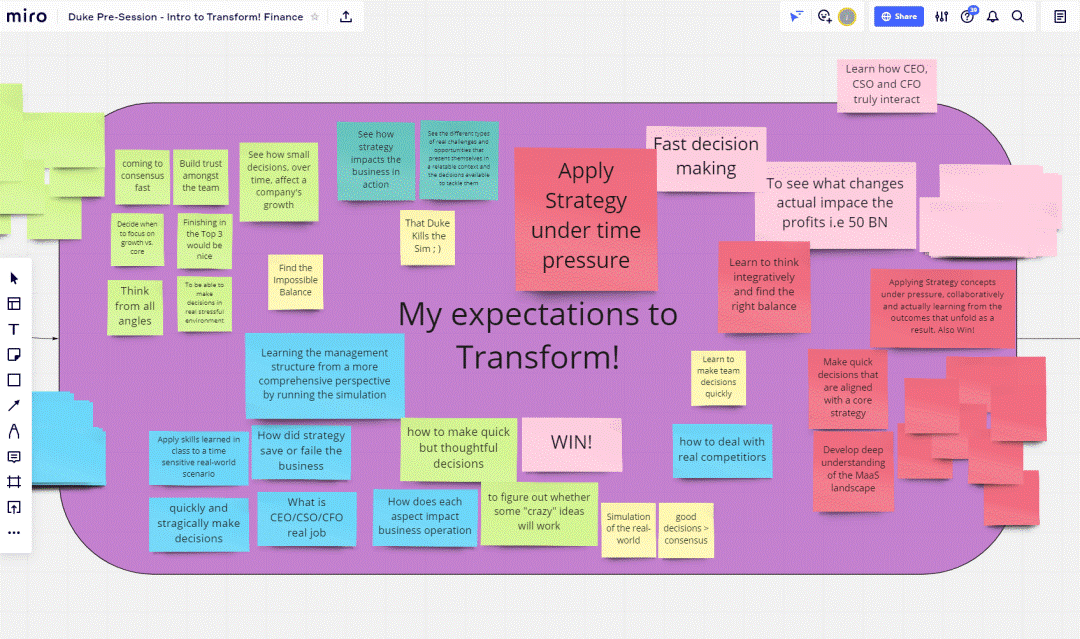 “Running Transform! with an active (internal) program co-facilitator delivered an improved experience. Professor O’Driscoll dug into the thinking process of the students and used the digital simulation as a platform to link multiple lessons and courses beautifully,” noted co-facilitator Enrico.