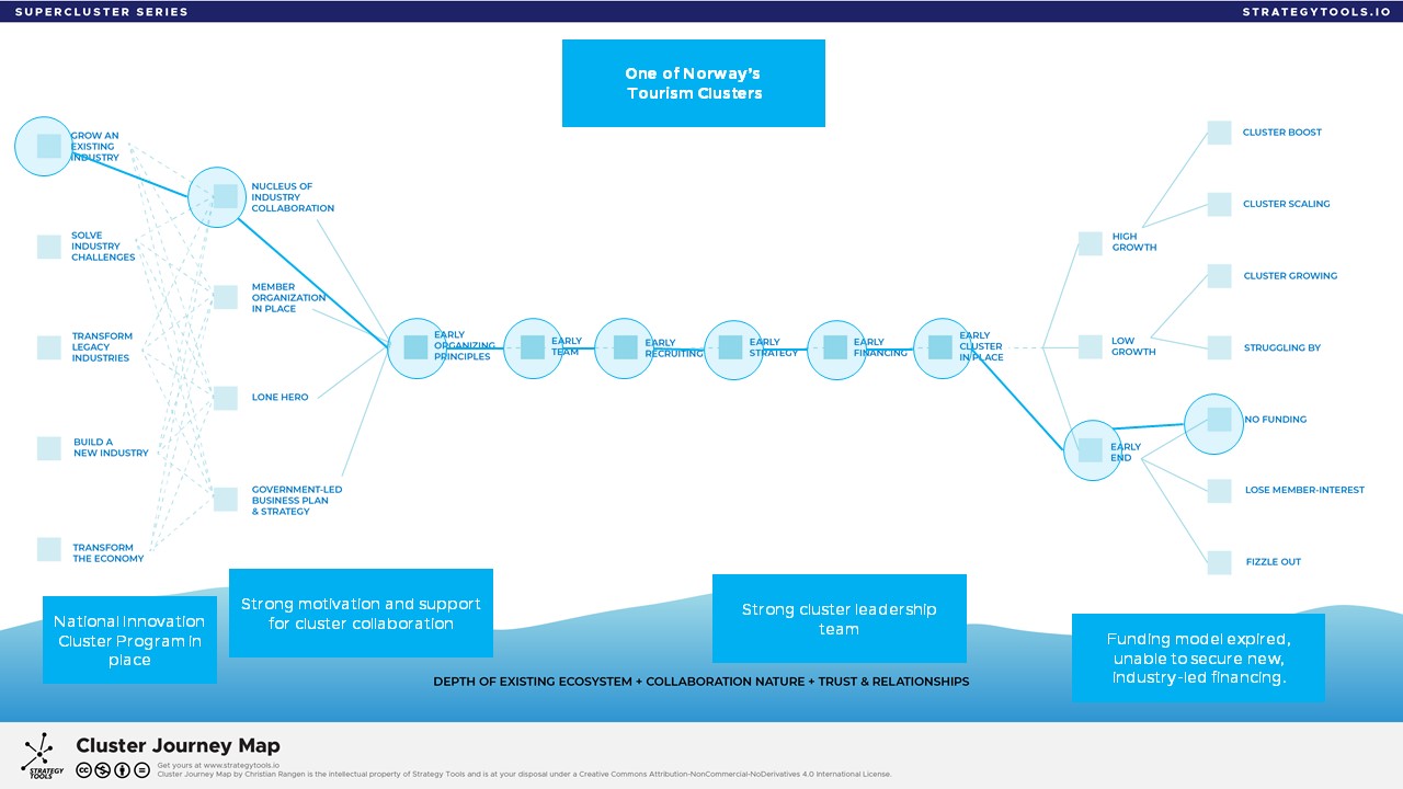 One of Norway’s leading tourism clusters, based on the country’s west coast, got started in 2008, on the shared interest in growing the country’s tourism industry. Fully recognizing the upside in better collaborating and building out the professionalism of the industry, the cluster was shaped by an early industry network. Over time, the cluster developed a formal organization, funding model and strategy. After a decade in operation, the cluster faced the final stages of the national financing program. Unable the find a new business model, the cluster chose to close down its management and cluster operation.