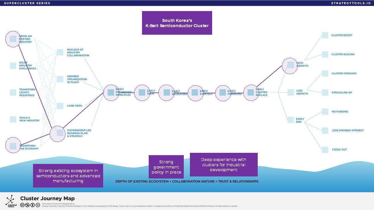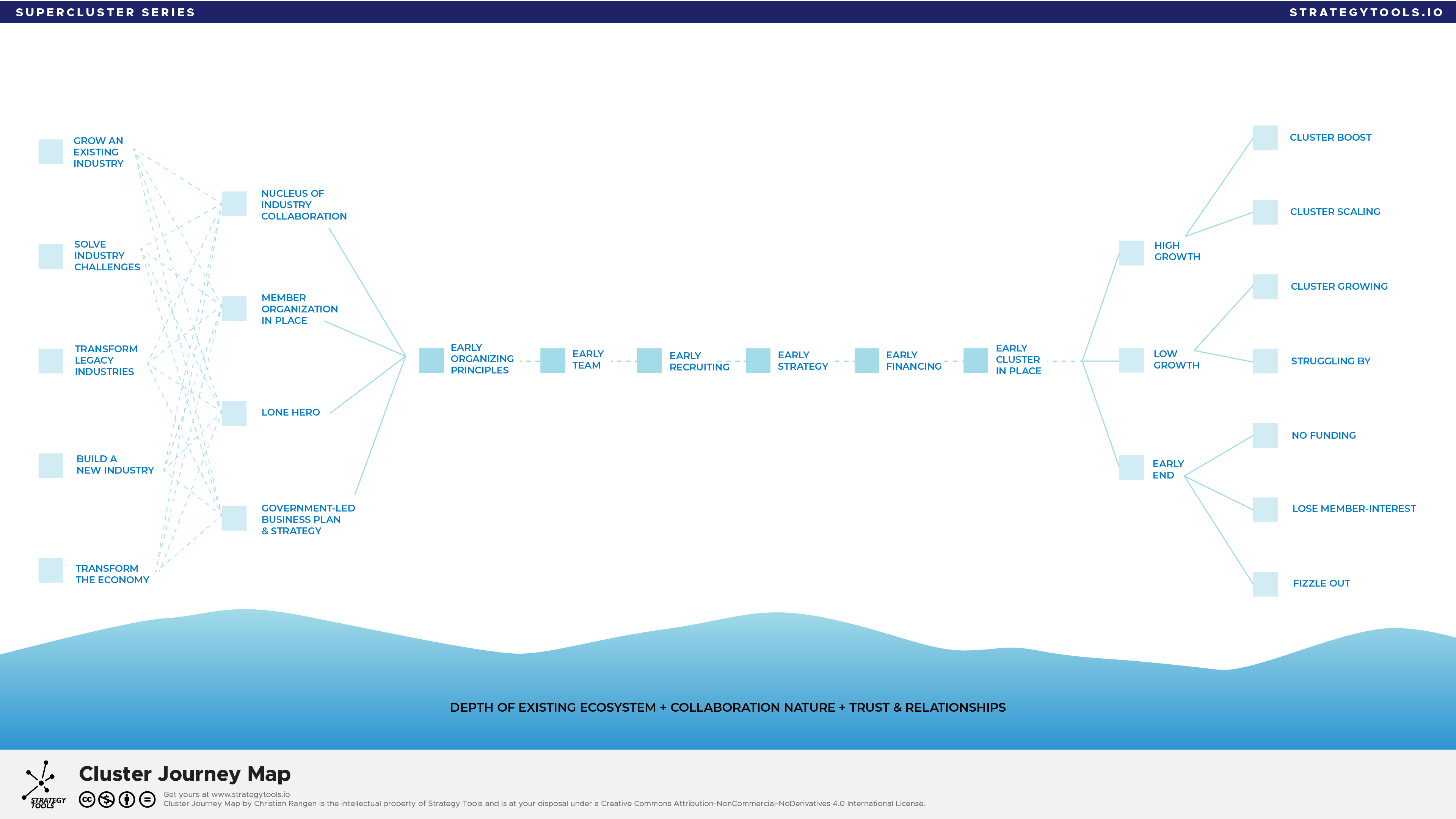 While who starts it may be quite different, the motivation for and the early journey a cluster may take can also vary greatly. Based on our work over the past decade, we have developed the Cluster Journey Map to illustrate how different paths cluster may take, from the starting point to the end outcome. Often, this is a journey that should be measured in decades, not months or years.