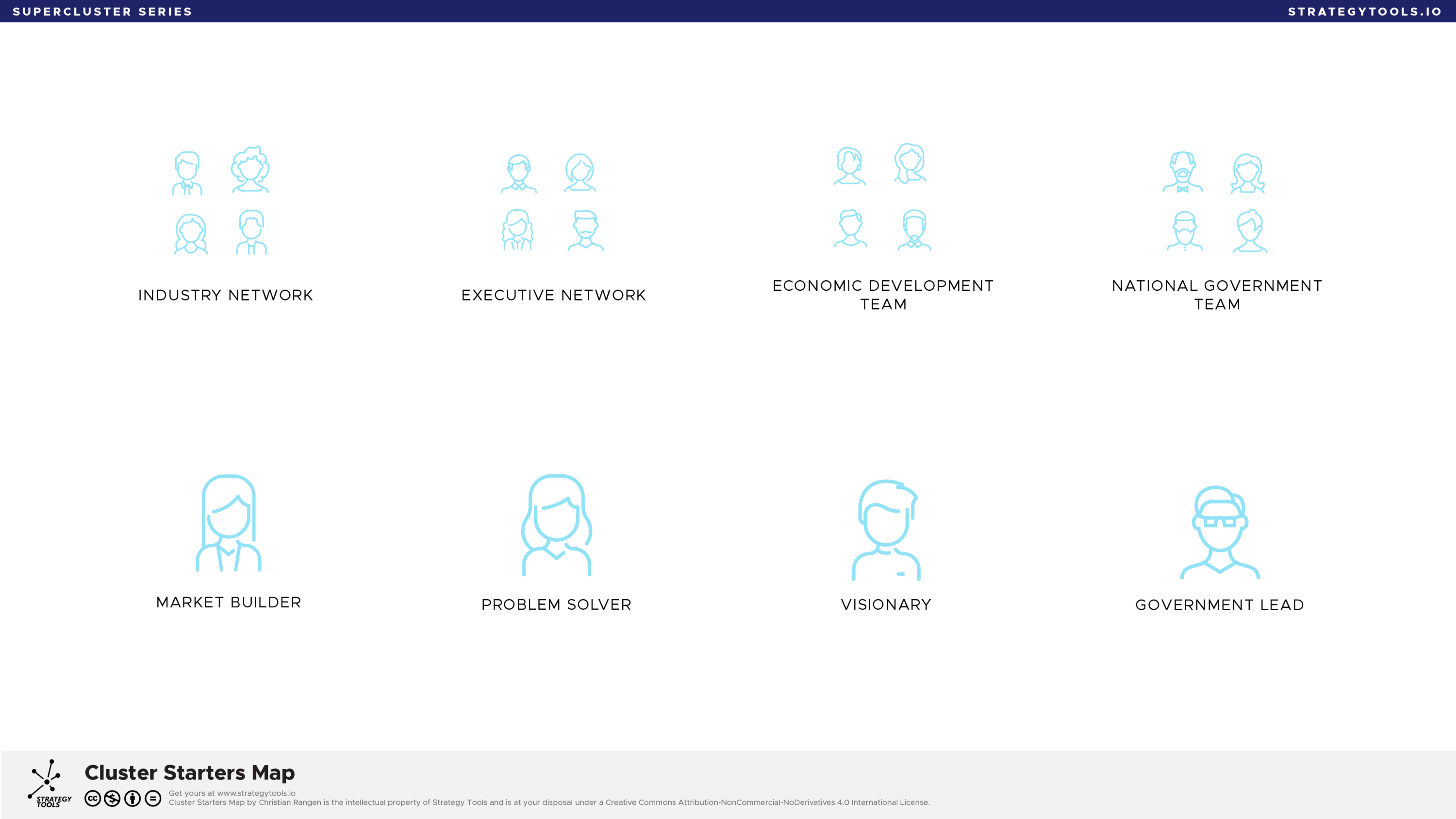 In our work with clusters around the world, we have identified eight profiles to answer the question, “who starts it”? These personas can be found in diverse location and countries around the world. They all share a passion for economic development and growth, but view the starting point and roadmap quite differently.