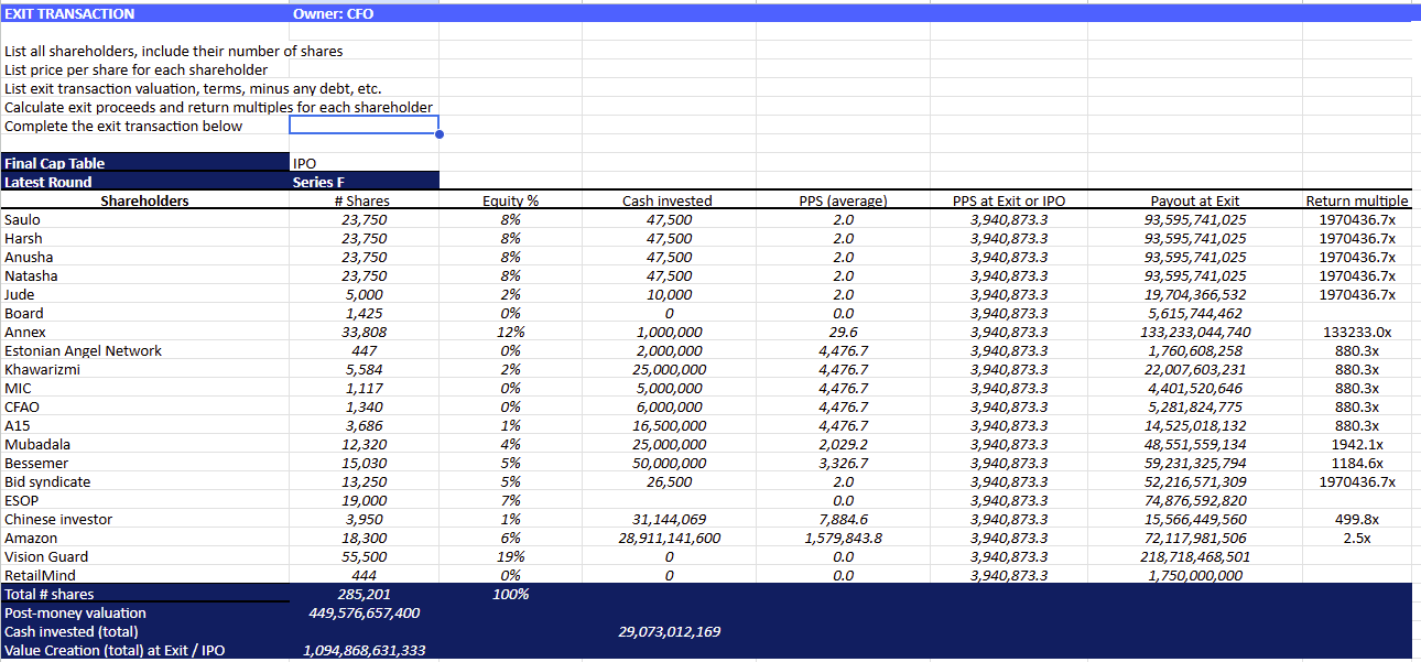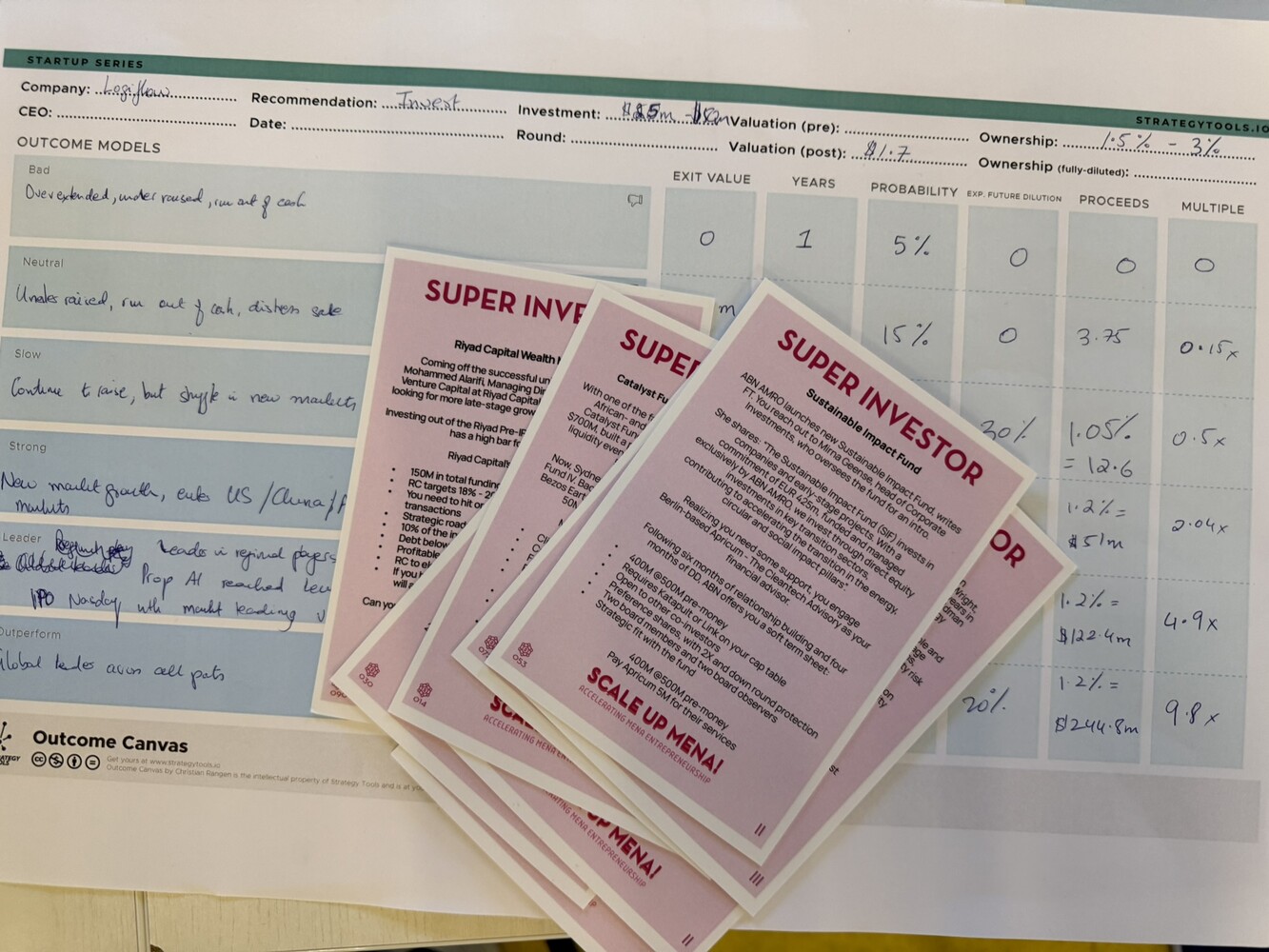 Every startup has two sets of customers. Your ‘product customers’ and your ‘equity customers’. What’s your strategy to create value for each of them? The four teams really got into that during the final stages of day two. Team one, Retail Mind, accepted an cash- and equity, $1,2BN M&A deal with LogiFlow. Team three, negotiating from a superb position, managed to land an $87BN M&A deal, delivering 267X back to their early investors (which came in at an exceedingly high valuation to begin with). Team four, Leo Bank structured a total of 15 equity financing rounds to hit a $1,2 Trillion valuation (think, OpenAI, just in MENA), and start IPO preparations for a future listing.