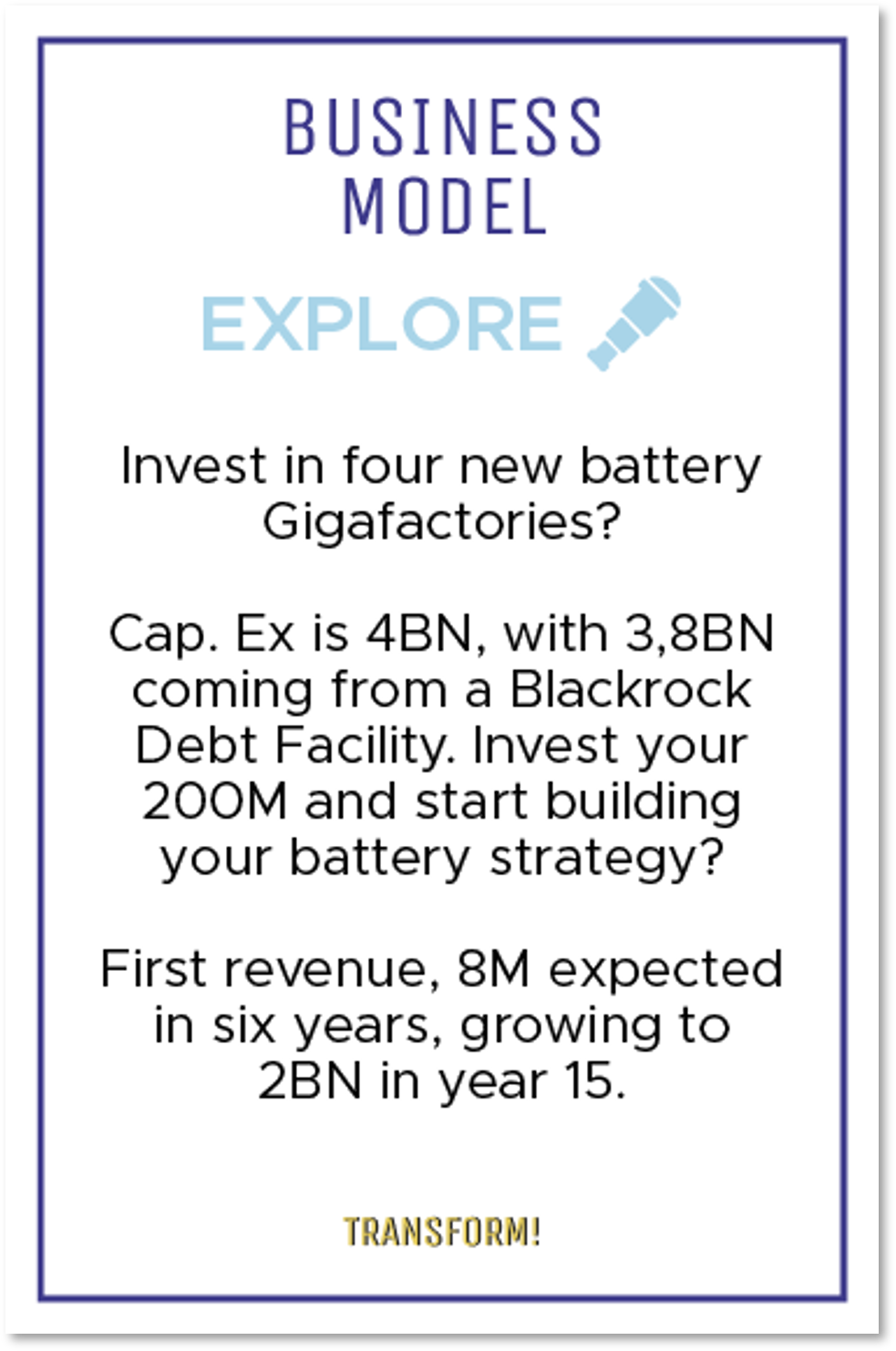 Building a business model portfolio can be tough. Should new gigafactories be a part of your transformation roadmap? But be careful with that 3,8BN debt facility.