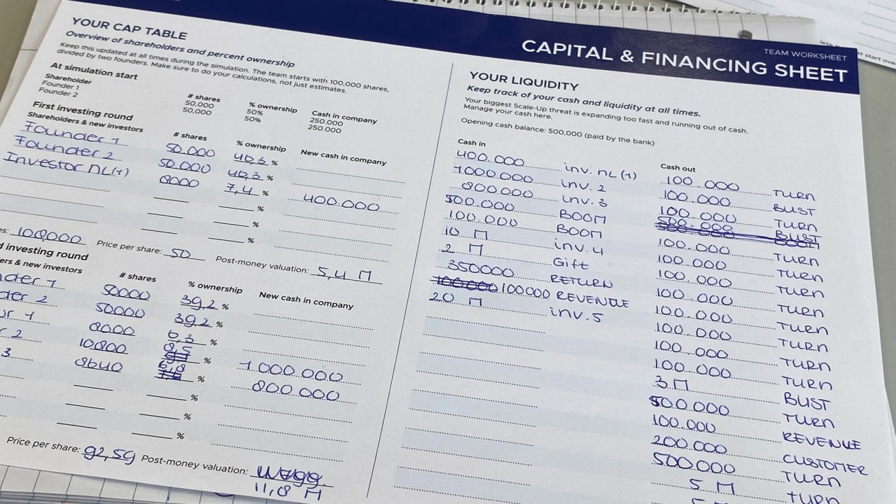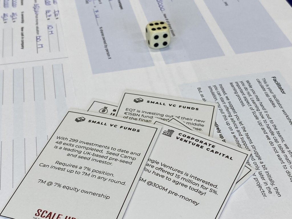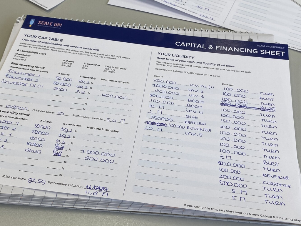 In Scale Up!, the cap table isn’t just a teaching tool – it is the backbone of the entire learning experience. Everything flows through it. Every strategic decision participants make, from hiring key talent to choosing between investor offers, ultimately shows up in their cap table.