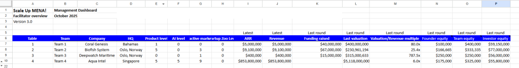 This is a monster to run, but once it is running it is fantastic. Due to the holistic view on each startup, the full management dashboard takes the Scale Up! experience to another level – but only if you as a facilitator can handle it. You need deep financial literacy, strong group facilitation skills, and the ability to rapidly diagnose where teams are stuck. Plan for at least two facilitators for groups larger than 20 participants. The upside? Teams leave with genuine strategic capabilities that transfer directly to their real companies.