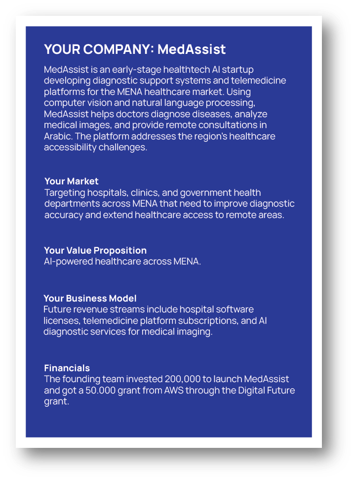 Here is MedAssist, a fictive case company based in MENA. Your job, guide them through five round of early-stage financing. Make the investments. Update the cap table as needed. Below are 15 early-stage mini-term sheets, based on terms you might likely see at each stage. These are based on market standards in the region.
