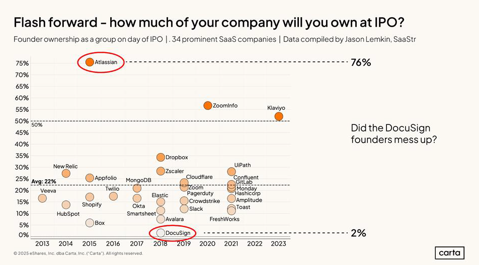 Think about that. Less than four years after incorporation, the founding team typically owns less than a quarter of their company.
