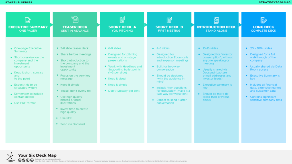 Too often, we have seen founders send out their pitch deck (which is not designed to be sent out), and equally often we have seen founders try to cramp 21 slides into a 30. Min first meeting call (when a 6-slide meeting deck would have sufficed). Most founders, maybe even 90%, bring the wrong tool for the job. As a founder, make sure you have the right toolkit available to you. In our experience. That means six unique investor decks, each serving its own purpose, each perfect for its own job.