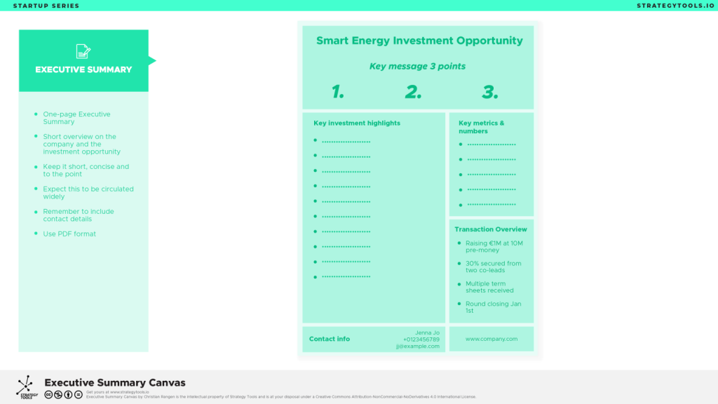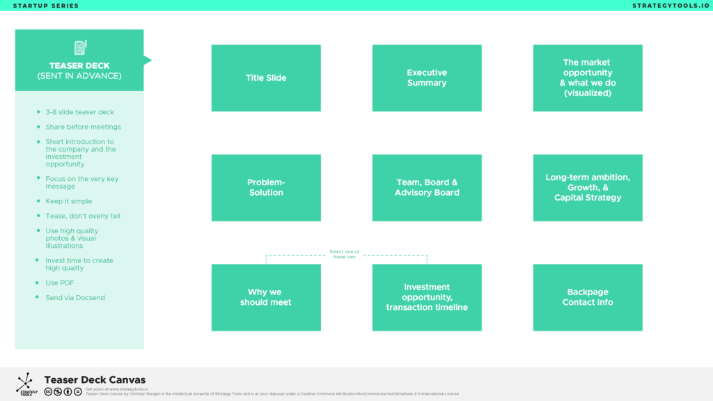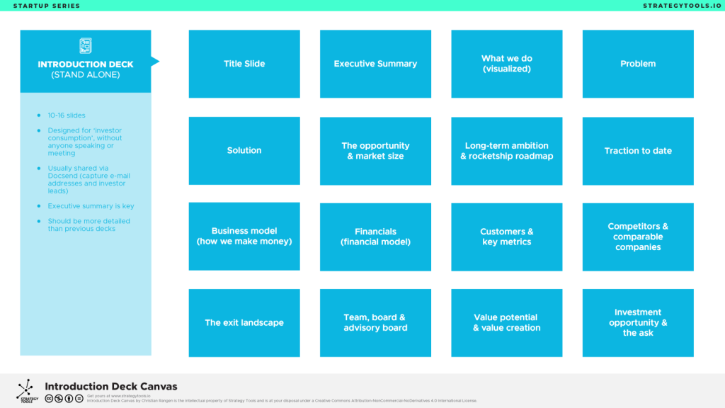 Format: 6-8 slides. Use for pitches, not for sending out
