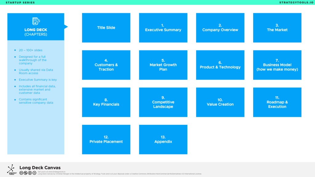 Format: 20-100+ slides, regularly 50-60 slides. Only shared to most serious investors, maybe after the first 3-4 meetings