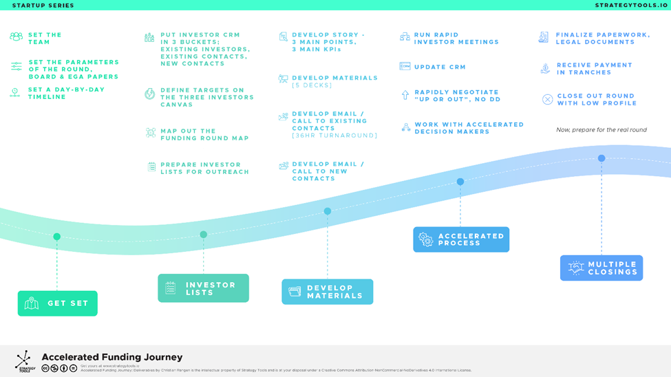 Most pre-seed founders should be able to run a fast, accelerated fundraising process. We call this the accelerated fundraising journey. The point here is that this process is designed for speed, for getting the money in fast and quickly getting back to building the business.