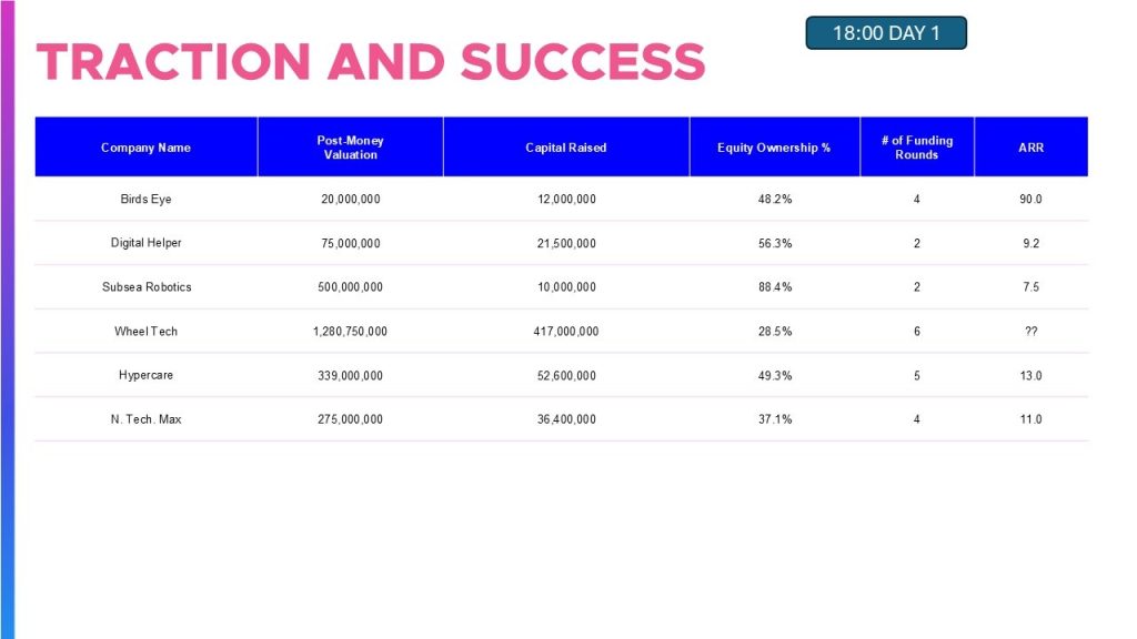 Hectic capital market Closing out day 1, we say 23 equity financing rounds completed, one unicorn, one pony (half-a-unicorn), and valuations ranging from 1,3BN to 20M. Maybe more important, ARRs were ranging from 90M (very impressive) all the way down to a ‘yet to launch’ strategy and zero ARR.