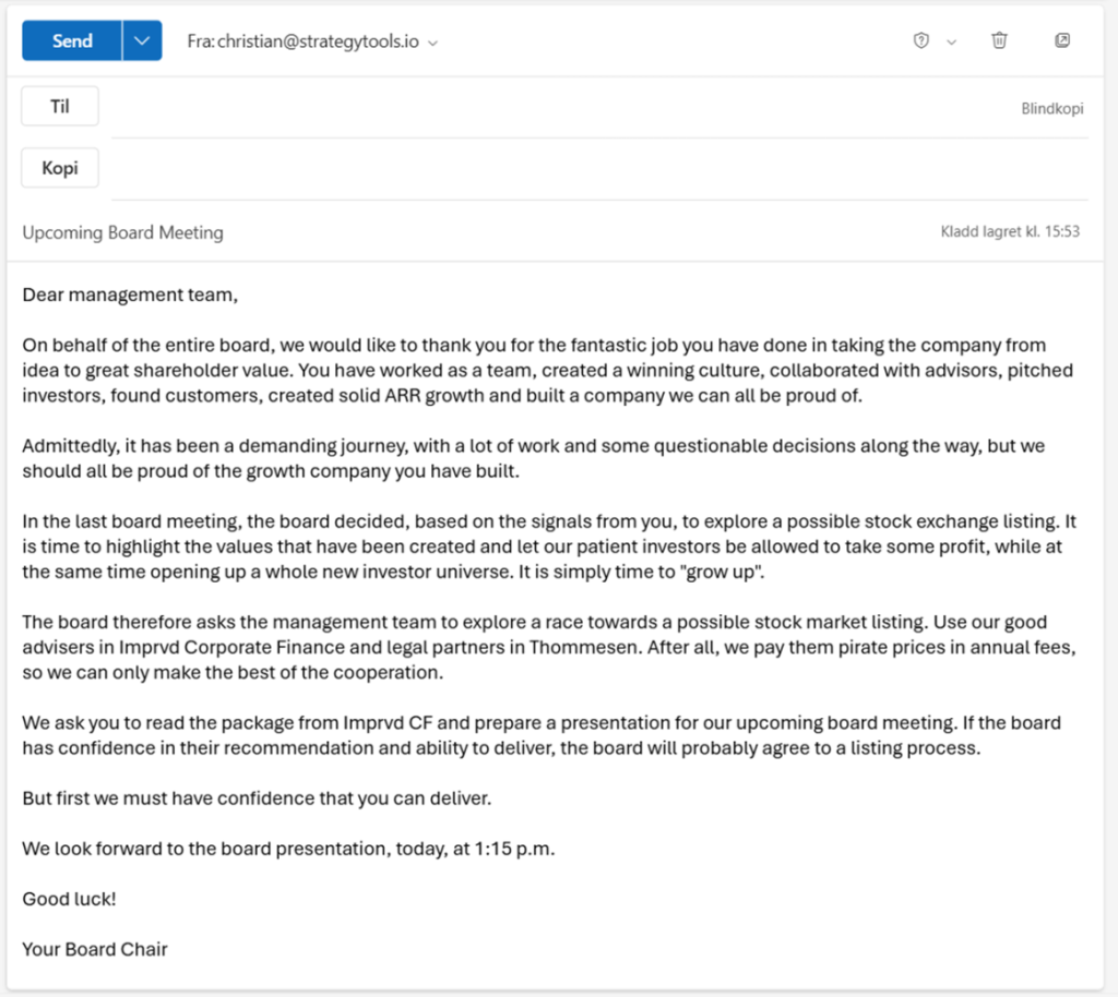 Upcoming board meeting Of course, sprinting through the Founder’s Journey, there sooner or later comes a time to exit. In our case, the board was eager to see a successful listing, allow the company to seek a winning public market position. Easy? Not all. Happens in real life? All the time.