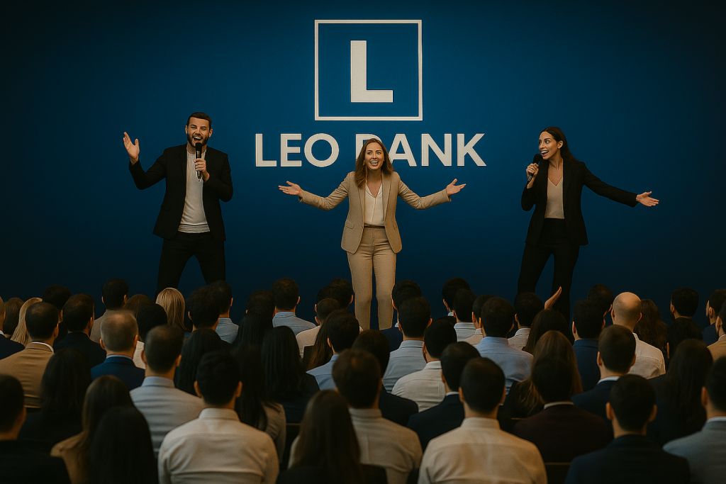 Leo Bank’s three remaining founders on stage for the monthly all hands meeting. As the company grew to 85, then 120, then again 200+ employees, leadership and culture become a far bigger challenge than the team was ready for