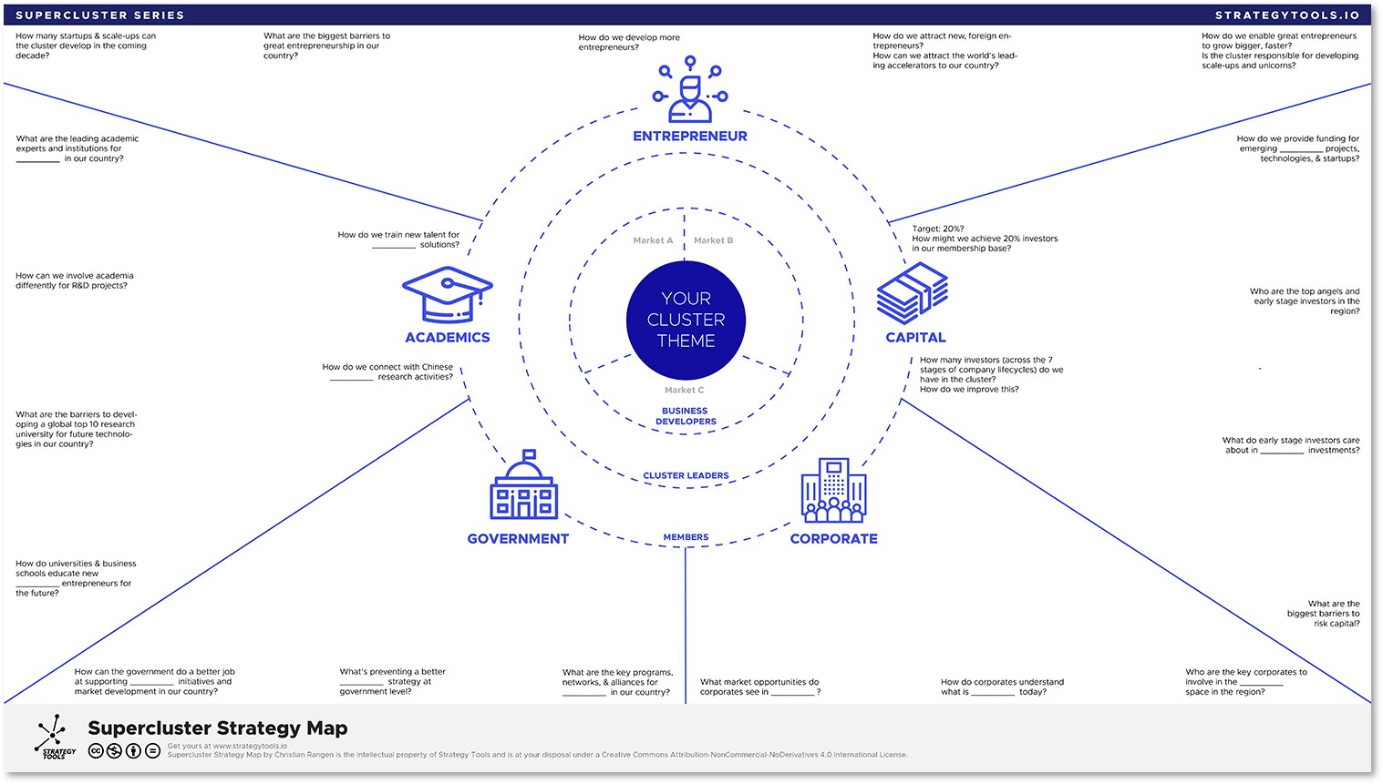 Built on the research by MIT, Harvard, and BI Norwegian Business School, the Supercluster Strategy Map details the five fundamental pillars of building a supercluster – corporate, government, academics, capital, and entrepreneur.