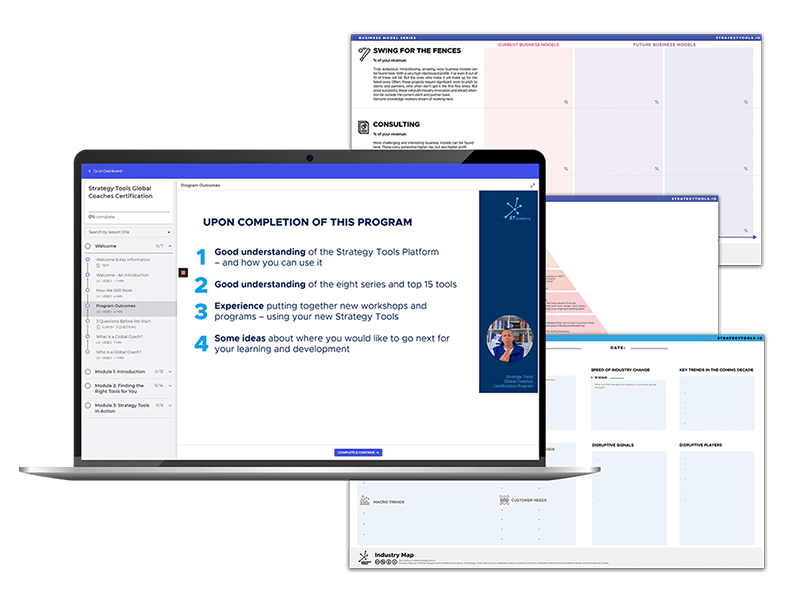 Strategy Tools Global Coaches Program is an action-based program that helps you maximize your strategic impact. During 3 modules, with nearly 5 hours of bite-sized content, you will learn how to master our top 15 powerful strategy tools, go through numerous relevant case studies that you can use in your context, tackle advanced facilitation and masterclass techniques and learn how to design workshops.