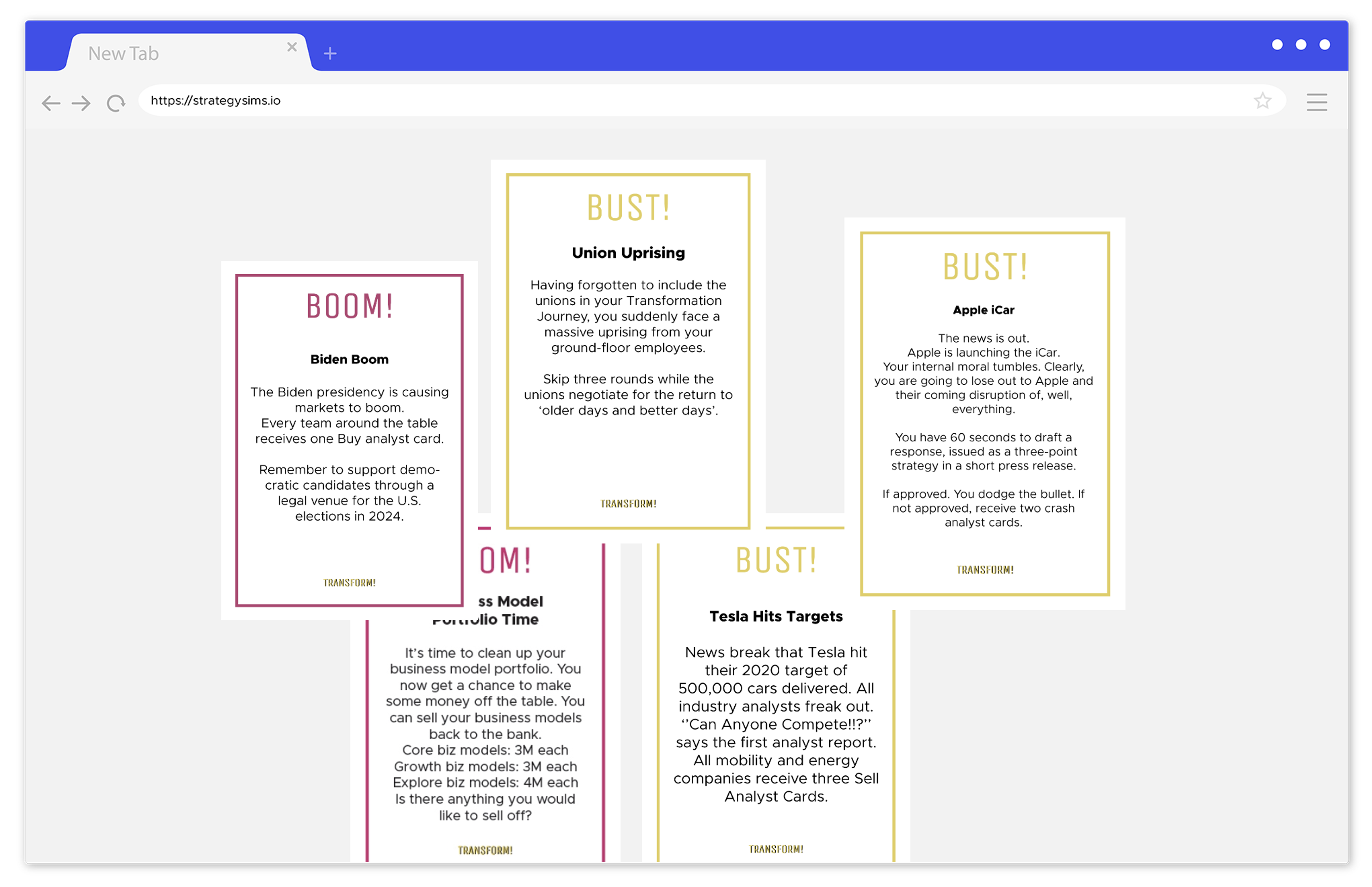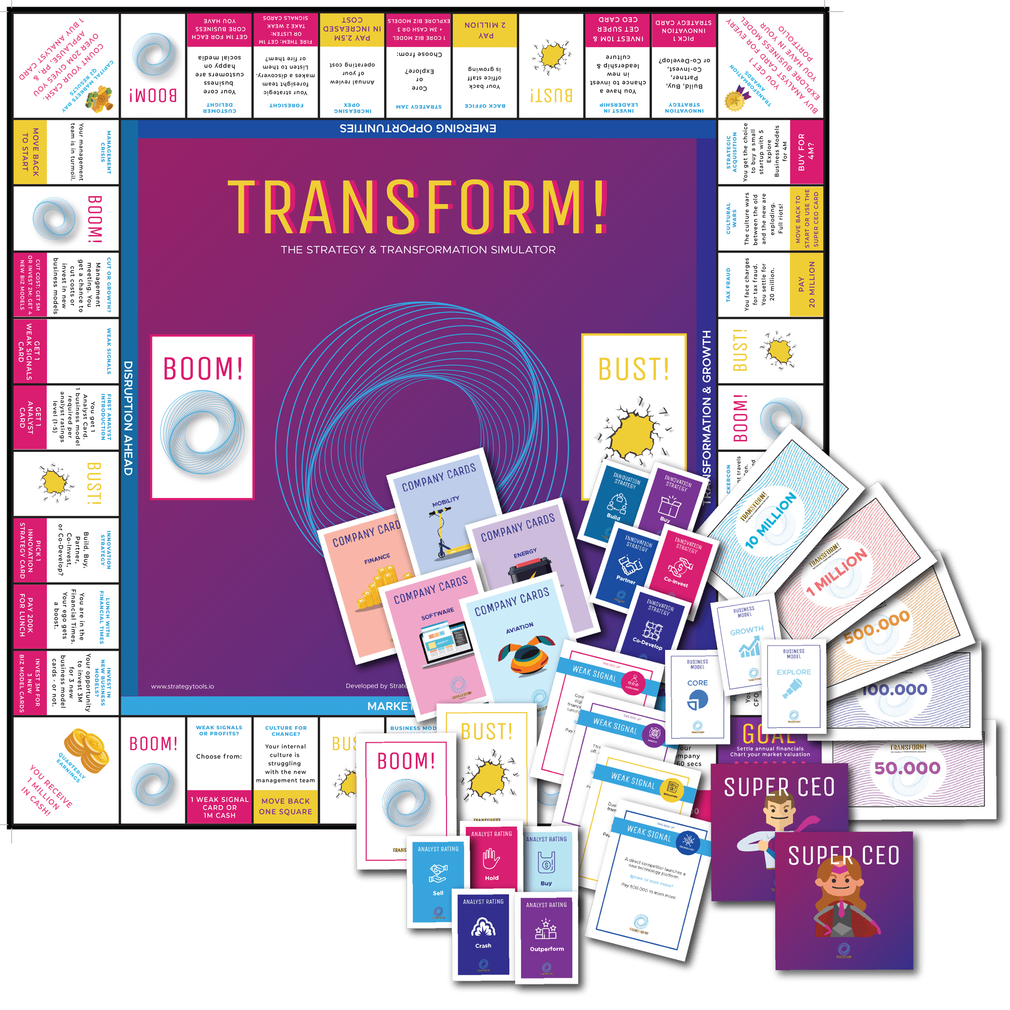 Transform! puts you in directly into the C-suite. Work with your management team. Design a transformation strategy. Deal with unions, activist investors and hostile take-overs. Can you design the winning strategy to 50BN in market cap?