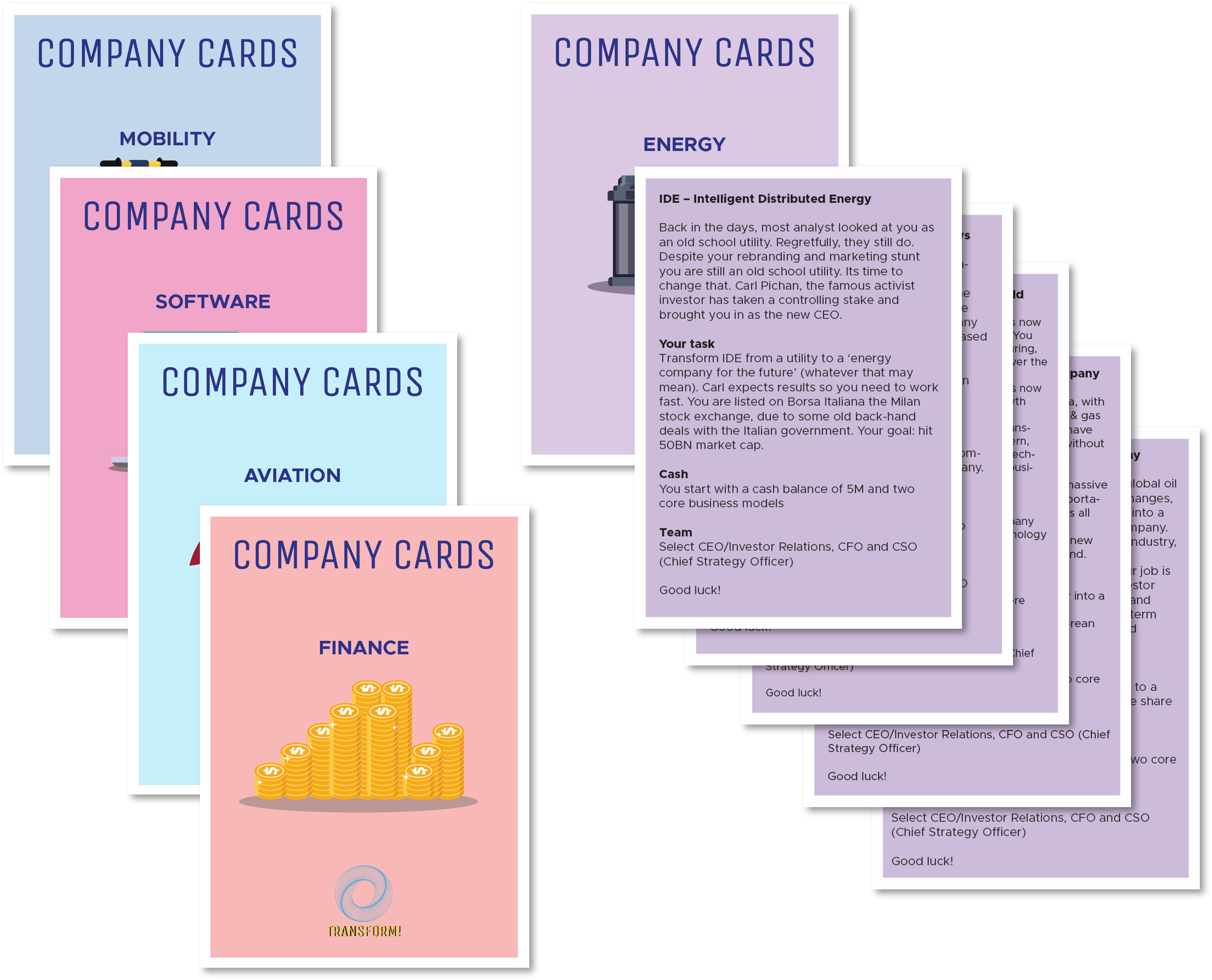 Transform! comes with a wide selection of pre-defined Company Cards. Select between energy, finance, software, aviation or mobility. These company cards set the opening stage; but expect significant transformation as the simulation gets underway.