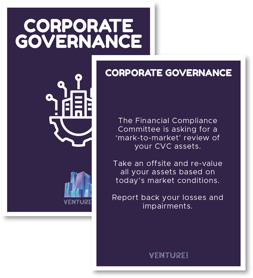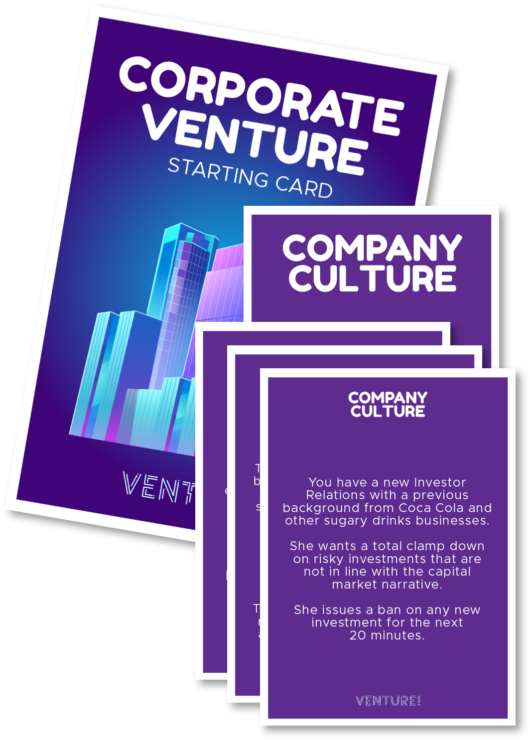 In Corporate Venture! you take on the role of a new CVC team in an established company. Your job: build and deliver a successful CVC strategy. This, of course, is not as easy as it sounds. You must navigate a massive level of complexity, make rapid-fire decisions on strategy, dealflow, investments, partnerships or outright hostility toward the other teams.Yes, that’s right. You are competing (or collaborating) with up to four other teams around the ‘table’. You are all in the same industry space, but with very different strategies and targets. Best CVC performance wins.
