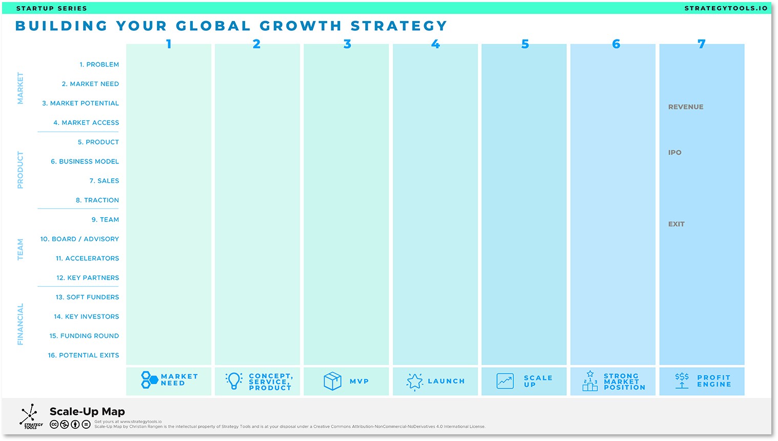 The Scale-Up Map enables you to map out your growth strategy in a single view. It helps startups to look beyond the now and build a short-, medium- and long-term growth strategy. On a single page, you will be able to map out and keep track of the key value drivers for your startup, and align your team, board, and investors around your scale-up plan.