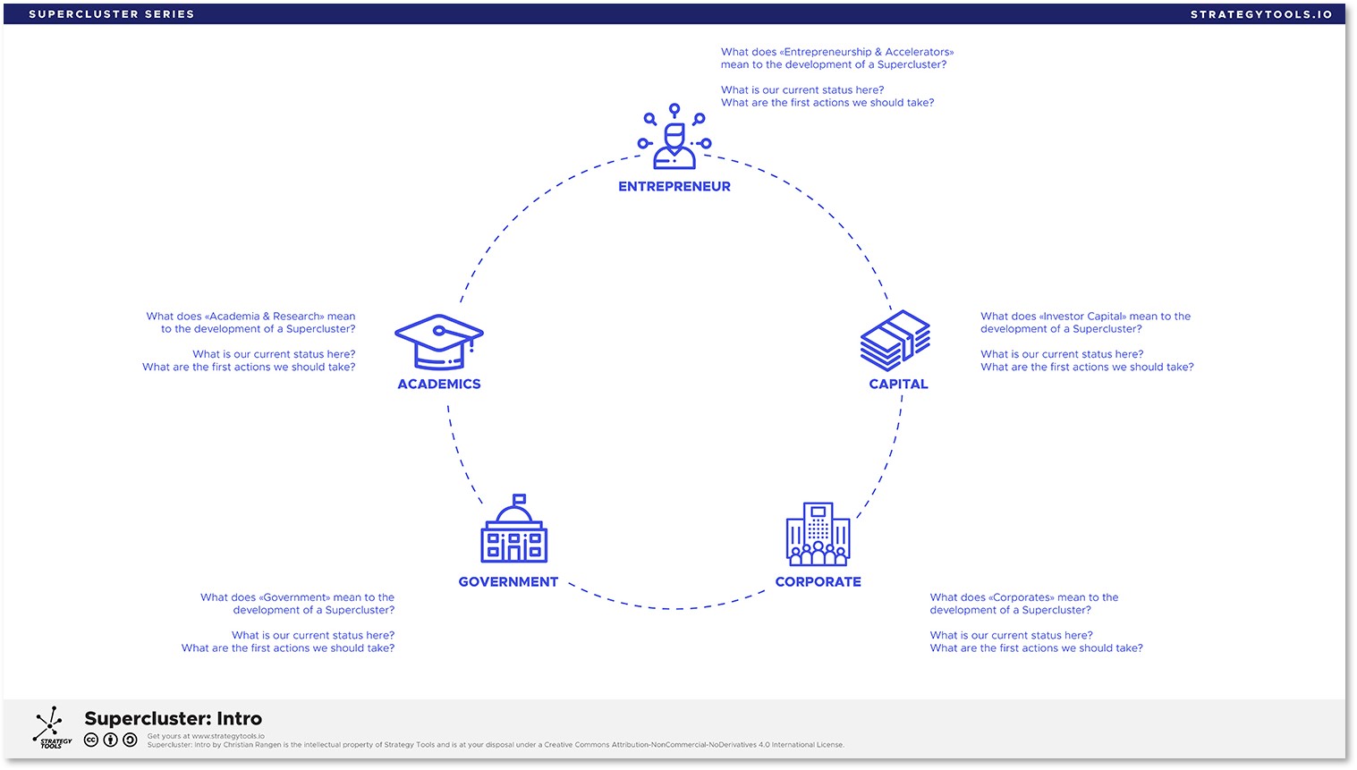 Supercluster Into is used in the very first cluster conversations. Provides an understanding of clusters beyond the Triple Helix theory. Gives a high-level introduction to the five building blocks of any supercluster strategy.